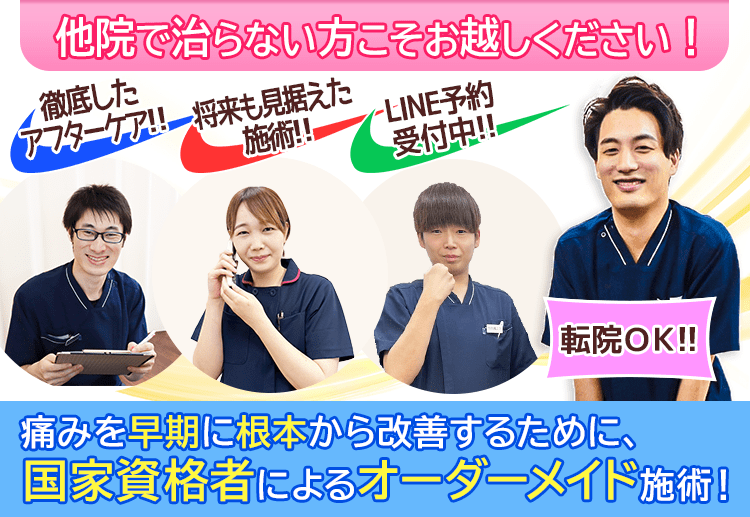 また、予約時間の1時間前まで当日予約も承っておりますので、急に痛みが出てきた場合や、たまたまお時間ができた場合も、お気軽にご連絡ください。